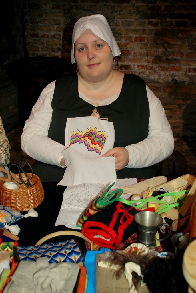 Muzeum Bursztynu na tę noc zamieniło się w targ dawnych rzemieślników. Tajniki haftów, sztuki krawieckiej, jubilerstwa, czy malarzy XVII i XVIII wiecznych. To wszystko czekało na widzów na dziedzińcu Zespołu Przedbramia ulicy Długiej - niestety kolejka była długa i turyści czekali około godziny, ale za to oprócz zwiedzenia samego wnętrza muzeum mogli się przejść odwiedzając poszczególne nasze stanowiska.